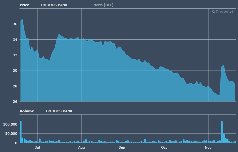Ceux qui suivent le cours de l’action Triodos sur Euronext n’auront pas manqué de remarqué que si le cours était à 26,82 € le 11 novembre, il passait à 30,49 € le 12, et même à 30,72 € le 13, soit une progression de 14,54 % ! Heureusement que la nature du certificat n’a pas changé, et que ce n’est pas devenu un instrument spéculatif ! Que s’est-il passé ?